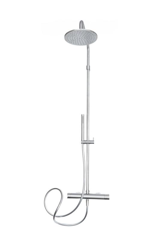 Duschkombinationen är tillverkad av högkvalitativ mässing och har en hållbar förkromad yta. Detta ger ett lyxigt utseende, utmärkt slitstyrka och långvarig tillförlitlighet. Tack vare den termostatiska blandaren förblir vattentemperaturen stabil, även vid varierande vattentryck.